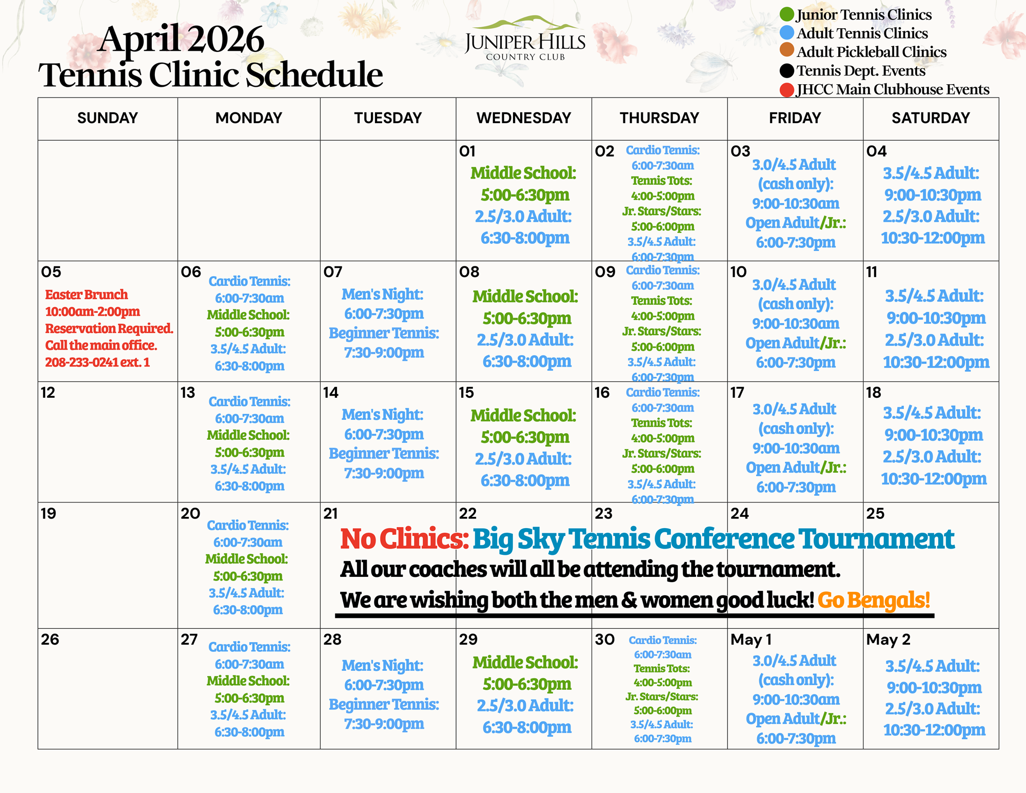Junior & Adult Tennis clinics and private lessons as well as Adult Pickleball clinics and private lessons are available year-round. Whether you’re a serious competitor, a beginner, or just out to have fun, there is a program to suit your needs. See the calendar for this month’s schedule.